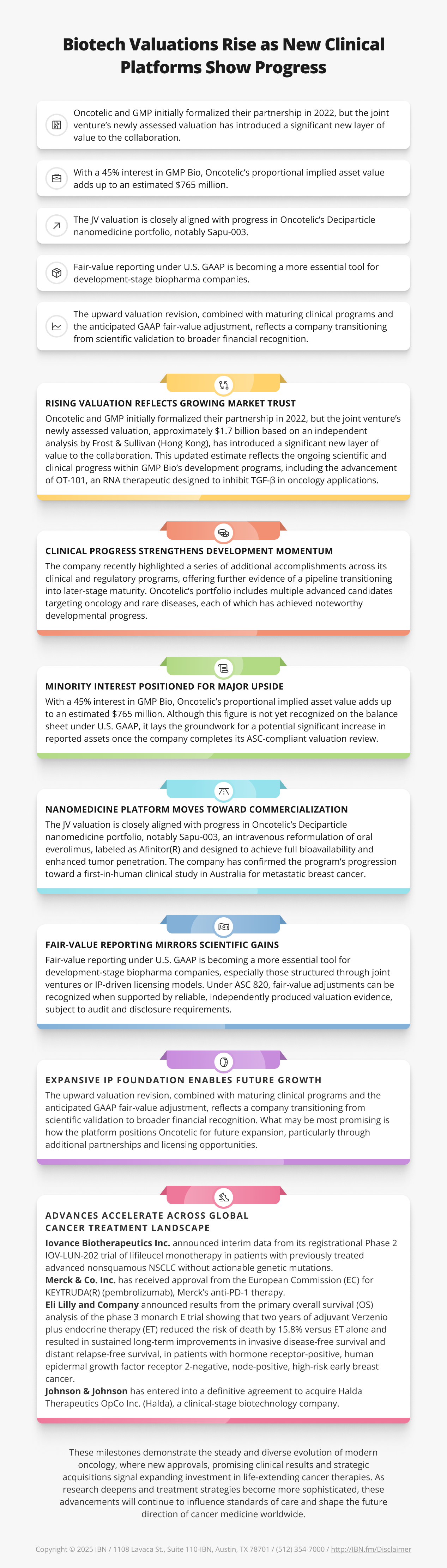 BioMedWire Editorial Coverage: As advanced biotech programs move closer to commercialization, fair-value adjustments under U.S. Generally Accepted Accounting Principles (“GAAP”) are increasingly recognized as meaningful signals of real scientific and business advancement. These valuations help translate research achievements into quantifiable economic impact, giving investors clearer insight into how innovation converts into company value. Oncotelic Therapeutics Inc. (OTCQB: OTLC) (profile) this trend as it prepares for a major fair-value update on its 45% ownership in joint venture (“JV”) partner GMP Bio, following a new independent assessment that points to a substantial increase in the asset’s worth. This development further reinforces Oncotelic Therapeutics’ position as a treatment leader, along with others in the oncology-treatment space, including Iovance Biotherapeutics Inc. (NASDAQ: IOVA), Merck & Co. Inc. (NYSE: MRK), Eli Lilly and Company (NYSE: LLY) and Johnson & Johnson (NYSE: JNJ).
